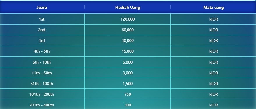 6. Hadiah Turnamen dengan total hadiah senilai IDR 600.000.000 yang akan dibagikan selama periode promosi.